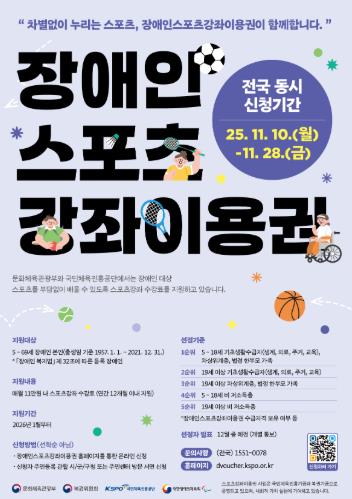 장애인 스포츠강좌이용권 지원 대상은 만 5~69세 등록장애인이며 신청은 장애인 스포츠강좌이용권 누리집 또는 읍·면·동 행정복지센터에서 하면 된다.