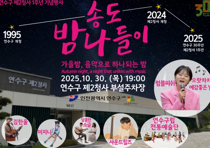[뉴스앤톡] 연수구는 오는 30일 19시 연수구 제2청사 부설주차장 특설무대에서 제2청사 개청 1주년을 지역 주민과 함께 축하하기 위해 기념행사 ‘송도 밤 나들이’를 개최한다.