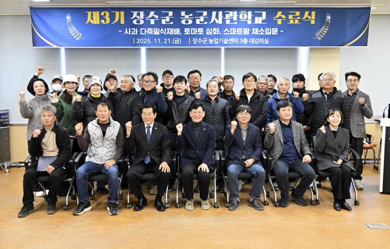 [뉴스앤톡] 장수군은 농업기술센터 대강의실에서 미래 농업을 선도할 전문 인력 양성을 위한 ‘농군사관학교 3기 수료식’을 21일 성황리에 개최했다고 밝혔다.