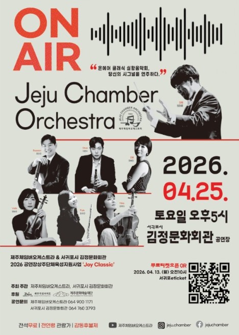 [뉴스앤톡] 서귀포시는 2026년 공연장 상주단체 육성지원 사업의 일환으로 제주체임버오케스트라의 공연 '온 에어'를 4월 25일 오후 5시에 김정문화회관에서 개최한다고 밝혔다.