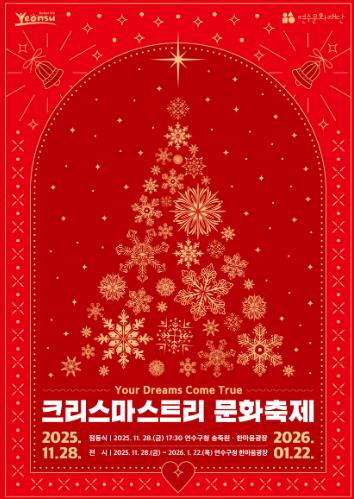 [뉴스앤톡] 연수구가 주최하고 (재)연수문화재단이 주관하는 ‘2025 크리스마스트리 문화축제’가 내년 1월 22일까지 구청 1층 송죽원과 한마음광장, 연수구 제2청사에서 열린다.