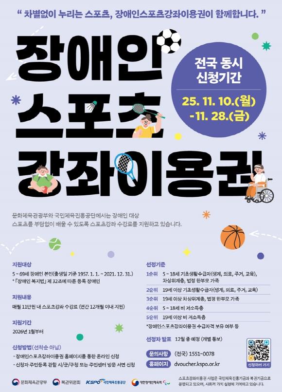 장애인스포츠강좌이용권 지원사업은 관내 5~69세까지의 장애인을 대상으로 1인당 월 11만 원 범위 내 강좌 수강료를 지원하는 사업이다. 대상자로 선정되면 2026년 한 해 동안 스포츠강좌 이용권 전용카드로 매월 수강료를 지원받게 된다.