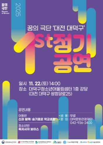 [뉴스앤톡] 대덕문화관광재단은 오는 22일 대덕구청소년어울림센터에서 ‘2025 꿈의 극단 대덕구 정기공연’을 개최한다고 밝혔다.