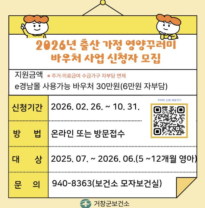 [뉴스앤톡] 거창군은 관내 영아의 건강한 발달과 출산 가정의 경제적 부담을 경감하기 위해 26일부터 ‘출산 가정 영양꾸러미 바우처 지원사업’ 신청을 받는다고 밝혔다.