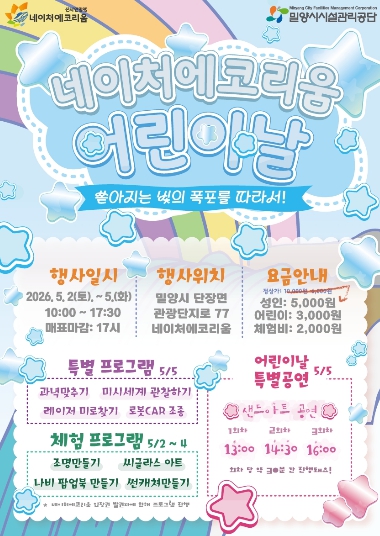 [뉴스앤톡] 밀양시시설관리공단(이사장 김경민)은 오는 5월 2일부터 5일까지 어린이날을 맞아 선샤인 밀양 테마파크 내 네이처에코리움에서 가족 단위 방문객을 위한 ‘제3회 네이처에코리움 어린이날 행사’를 개최한다.