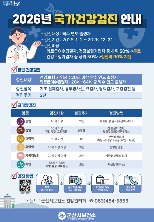 군산시 보건소 관계자는 “우리나라 사망원인 1위인 암 예방을 위해 국가 암 검진에 적극 참여해 주시기 바란다”라며 “연말에는 검진 수요가 집중되는 만큼 상반기에 미리 검진을 받는 것을 권장한다”라고 말했다.