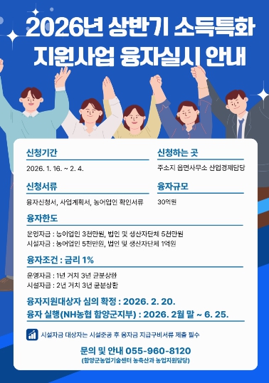 [뉴스앤톡] 함양군은 농업인의 경영개선과 농업 경쟁력 강화를 위한 ‘2026년 상반기 소득특화지원사업’을 시행하고, 오는 2월 4일까지 융자신청을 받는다.