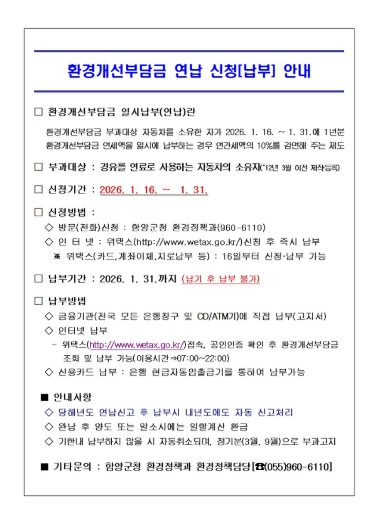 [뉴스앤톡] 함양군은 경유를 연료로 사용하는 자동차(2012년 3월 이전 제작·등록에 한함)에 매년 3월과 9월 부과되는 환경개선부담금의 일시 납부(연납)를 1월 31일까지 접수 받고 있다.