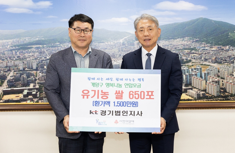 [뉴스앤톡] 인천광역시 계양구는 지난 22일 KT부천지사에서 지역 내 어려운 이웃을 돕기 위해 유기농 쌀 650포(4kg)를 기탁했다고 밝혔다.