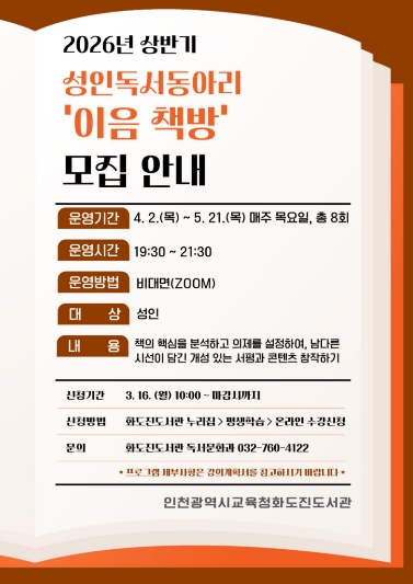 [뉴스앤톡] 인천광역시교육청화도진도서관은 성인의 독서역량과 비판적 사고력을 함양하기 위하여, 오는 16일부터 성인독서동아리 ‘이음 책방’ 참여자를 모집한다.