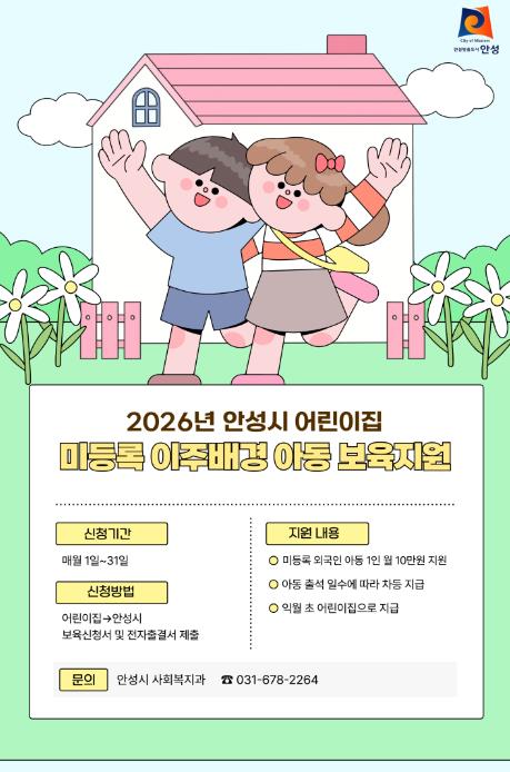 현재 안성시 관내 어린이집에 재원 중인 외국인 아동은 약 80명으로, 이번 지원을 통해 부모의 보육료 부담이 경감되고, 어린이집 외부에서 돌봄 사각지대에 있던 미취학 아동들도 안전하고 영유아친화적인 보육환경에서 성장할 기회를 얻게 된다.