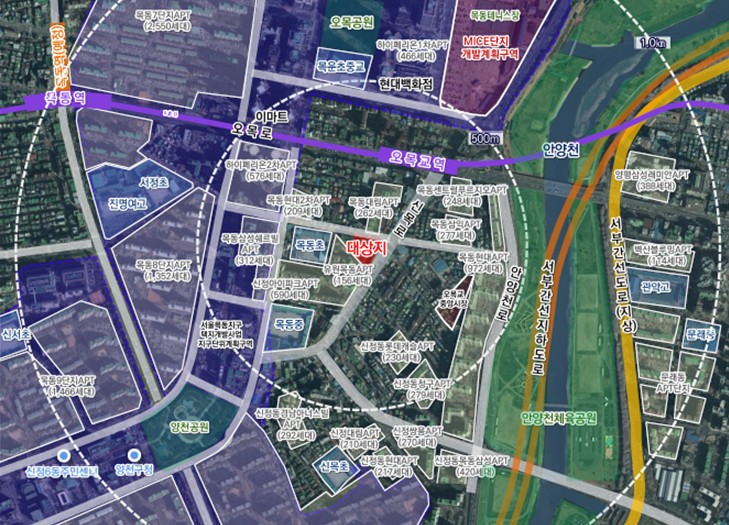 대상지는 오목교역 남측에 위치하며 목동신시가지아파트 단지와 안양천에 둘러쌓여 있는 우수한 입지적 특성을 갖추고 있으며, 목동중심지구의 배후 주거지로서의 개발 잠재력이 높은 지역이기도 하다.