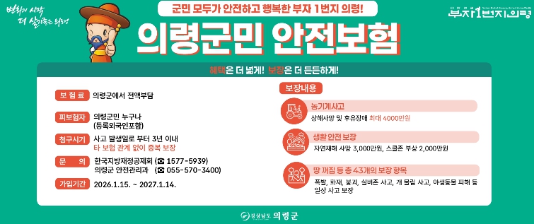 군민안전보험은 의령군이 보험료 전액을 부담하는 제도로, 의령군에 주민등록을 둔 모든 군민이 별도의 가입 절차 없이 자동으로 혜택을 받을 수 있다. 특히 올해부터는 등록 외국인까지 보장 대상에 포함해 의령에 거주하는 모든 주민이 차별 없이 안전 복지 혜택을 누릴 수 있도록 했다.