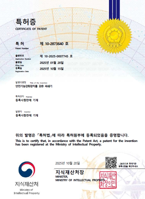 [뉴스앤톡] 제주특별자치도 농업기술원은 ㈜한성티앤아이와 공동으로 개발한 무선인식(RFID) 기반 안전기능 강화 장치를 갖춘 파쇄기 기술이 기술개발 특허로 등록됐다고 밝혔다.