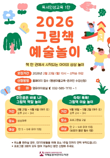 [뉴스앤톡] 인천광역시교육청서구도서관은 영유아의 올바른 성장과 발달을 지원하기 위해, 오는 23일부터 독서인성교육 1탄‘그림책 예술 놀이’ 프로그램 참여자를 모집한다.