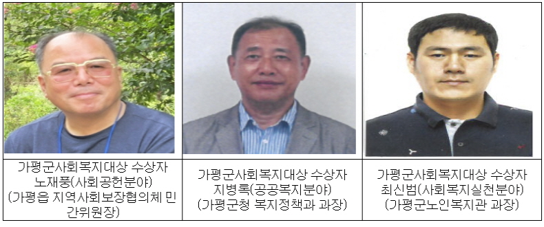 ‘가평군사회복지대상’은 사회복지 현장에서 묵묵히 헌신해 온 실천가를 발굴·포상함으로써 지역복지 향상에 기여한 인물을 격려하기 위해 가평군복지재단과 가평신용협동조합이 공동 주최한다.