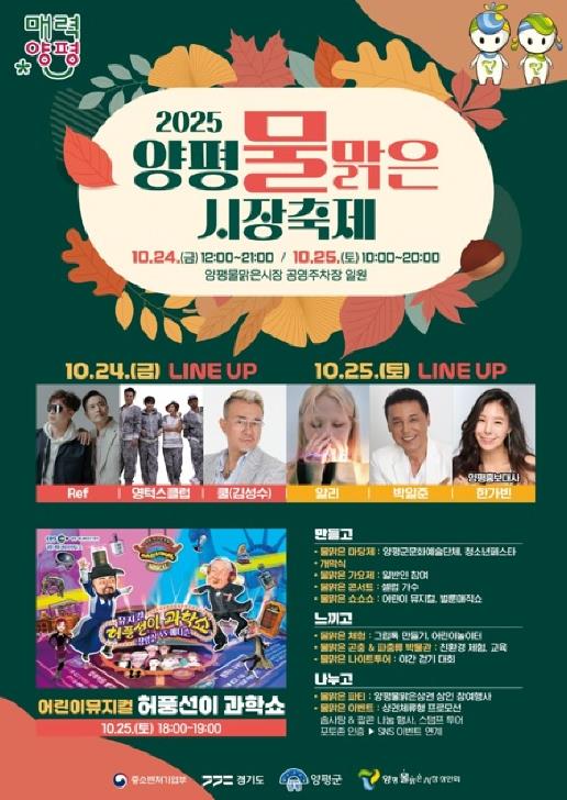 [뉴스앤톡] 양평물맑은시장의 대표 축제인 ‘2025 양평물맑은시장 축제’가 오는 10월 24일부터 25일까지 양평물맑은시장 공영주차장에서 열린다.
