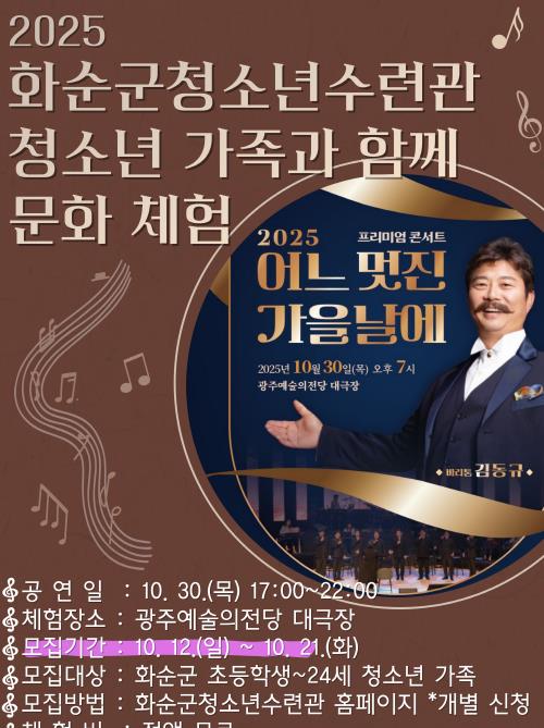 [뉴스앤톡] 화순군은 2일 청소년수련관에서 짙어가는 가을의 정취 속에 청소년과 가족이 함께하는 특별한 문화체험, 바리톤 김동규의 프리미엄 콘서트'어느 멋진 가을날'을 관람할 청소년 가족 60명을 선착순 모집한다고 밝혔다.