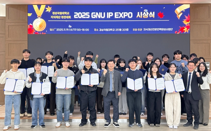 [뉴스앤톡] 경상국립대학교 지식재산전문인력양성사업단은 11월 19일 법과대학에서 지식재산 경진대회인 ‘GNU IP EXPO’ 시상식을 개최했다.