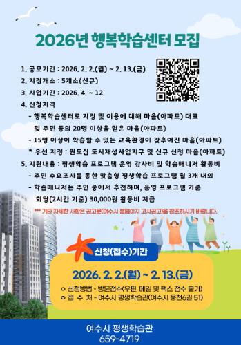[뉴스앤톡] 여수시는 주민 생활권 중심의 평생학습 기회를 확대하기 위해 '2026년 읍·면·동 행복학습센터' 신규 지정 사업에 참여할 마을(아파트)을 모집한다고 밝혔다.