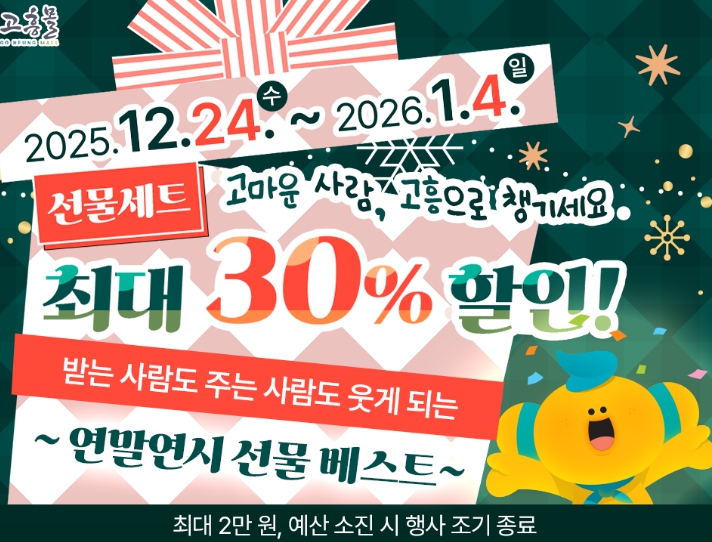 [뉴스앤톡] 고흥군이 운영하는 온라인 농수축특산물 쇼핑몰 ‘고흥몰’이 연말연시를 맞아 2026년 1월 4일까지 ‘고마운 사람, 고흥으로 챙기세요 – 연말연시 선물 베스트’ 기획전을 진행한다.