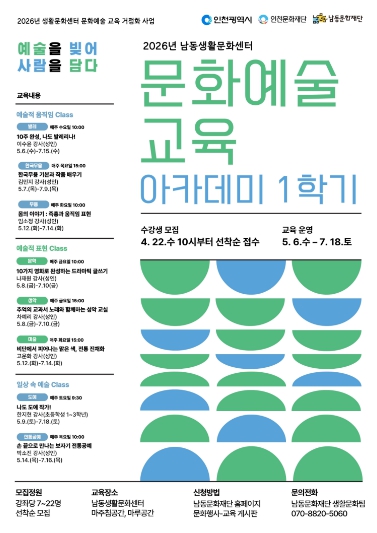 [뉴스앤톡] 인천시 남동문화재단은 오늘 5월 6일부터 7월 18일까지 남동생활문화센터에서 ‘2026년 남동생활문화센터 문화예술 교육 아카데미 1학기’를 운영한다고 17일 전했다.