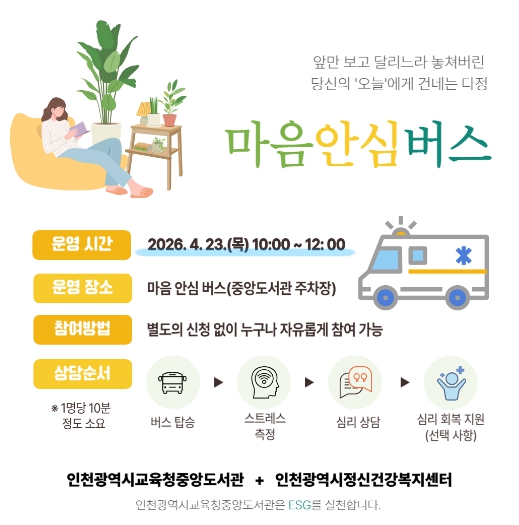행사는 23일 오전 10시부터 12시까지 중앙도서관 주차장에 마련된 마음안심버스에서 진행되며, 별도 사전 신청 없이 누구나 참여할 수 있다.