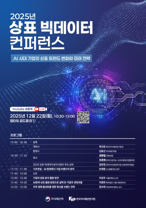 [뉴스앤톡] 지식재산처가 주최하고 한국지식재산연구원이 주관하는 ‘2025년 상표 빅데이터 학술회의’가 12월 22일 10시 30분 엘타워 골드홀(서울 서초구)에서 개최된다.