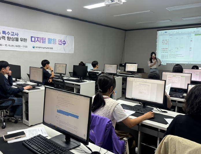 [뉴스앤톡] 대구남부교육지원청은 10월 14일과 15일 이틀간 새빛캐드컴퓨터학원에서 남부특수교육지원센터 교사 15명을 대상으로 디지털 활용 연수를 진행했다고 밝혔다.