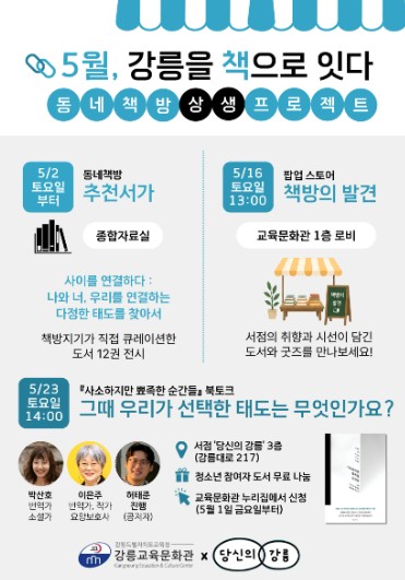 5월 16일 오후 1시에는 강릉교육문화관 로비에서 △팝업스토어 책방의 발견을 만날 수 있다. 서점의 취향과 시선이 담긴 도서와 관련 굿즈를 직접 만나볼 수 있으며, 도서관에서 동네서점의 분위기를 경험하며 책을 고르는 색다른 기회가 될 것으로 기대된다.