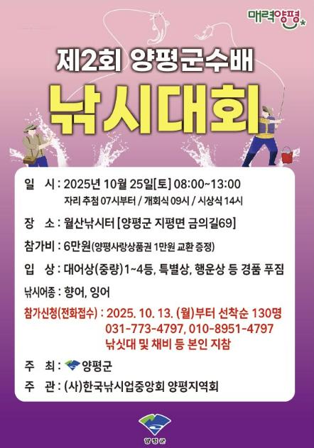 [뉴스앤톡] 양평군은 오는 25일 관내 월산낚시터에서 ‘제2회 양평군수배 낚시 대회’를 개최한다고 밝혔다.