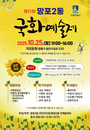 [뉴스앤톡] 수원시 영통구 망포2동 주민자치회는 오는 10월 25일, 영통구 지성공원에서 제11회 국화예술제를 개최한다. 태장동부터 이어져온 이번 축제는 지역주민이 함께 어울리고 즐길 수 있는 참여형 문화행사로 국화포토존, 친환경 공예품만들기 체험부스, 먹거리 장터, 플리마켓 등 다채로운 프로그램이 마련될 예정이다.