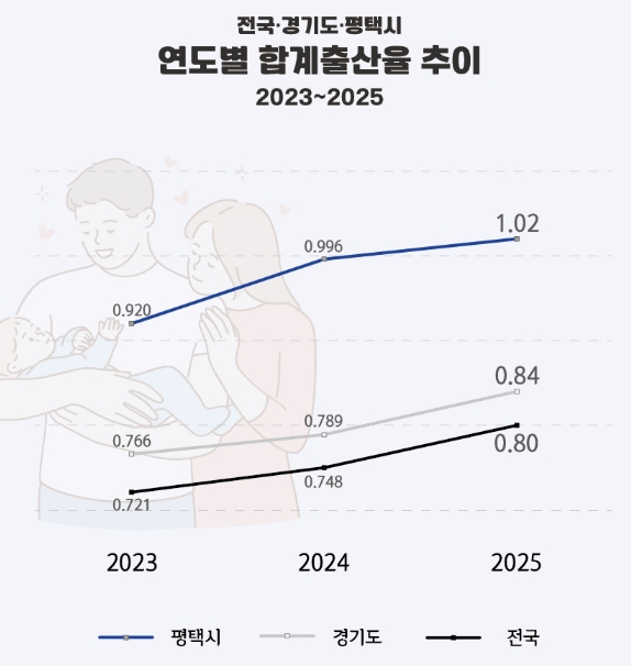 국가데이터처가 발표한 2025년 잠정 합계출산율에 따르면 평택시는 2024년 0.996에서 2025년 1.02로 상승하며 다시 1.0명을 넘어섰다. 2023년(0.92) 이후 2년 연속 상승이다.