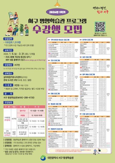 [뉴스앤톡] 대전 서구는 12월 5일부터 24일까지 2026년 1학기 평생학습관 프로그램 수강생을 모집한다.