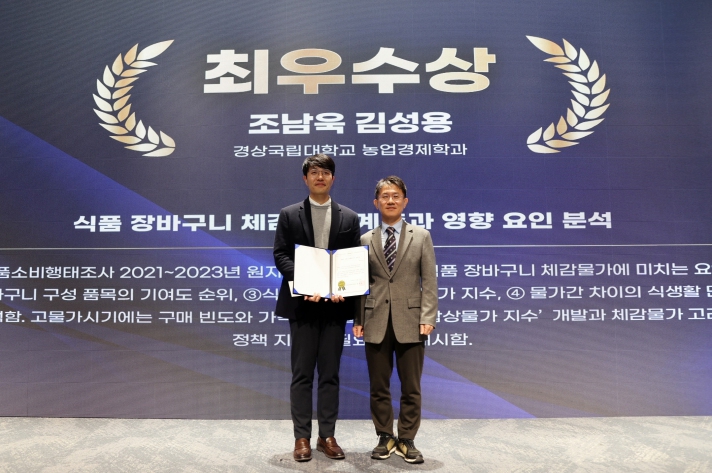 [뉴스앤톡] 경상국립대학교(GNU·총장 권진회) 농업경제학과 박사과정 조남욱 씨가 12월 12일 서울 양재aT센터에서 열린 ‘2025 식품소비행태조사 활용 우수논문 경진대회’에서 ‘최우수논문상’(지도교수 김성용)을 수상했다.