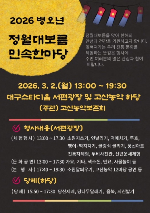 [뉴스앤톡] 대구 수성구는 2026년 병오년을 맞아 정월대보름을 하루 앞둔 다음 달 2일 대구스타디움 서편광장에서 고산농악보존회 주최·주관으로 구민의 안녕을 기원하는 ‘정월대보름 민속 한마당’을 개최한다.