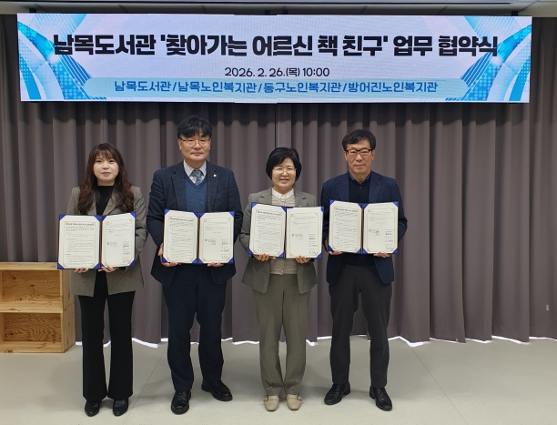 [뉴스앤톡] 남목도서관은 2월 26일 오전 10시 3층 다목적실에서 동구 지역 내 노인복지관 3개 기관과 함께 ‘찾아가는 어르신 책 친구’ 사업 추진을 위한 업무협약을 체결했다.
