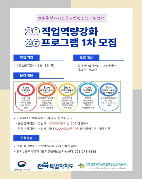 [뉴스앤톡] 전북특별자치도 학교 밖 청소년 지원센터(센터장 이상염)는 1월 26일부터 2월 13일까지 도내 만 15세 이상 24세 이하 학교 밖 청소년을 대상으로 ‘2026년 직업역량강화 프로그램’ 1차 참여자를 모집한다.
