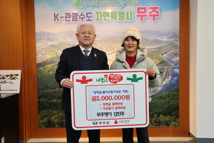 [뉴스앤톡] 무주군 무주읍에 위치한 한식 전문점 ‘무주명가’의 김민주 사장이 지난 14일 무주군에 이웃돕기 성금 1백만 원, (재)무주군교육발전장학재단에 장학금 1백만 원 등 총 2백만 원을 기탁했다.