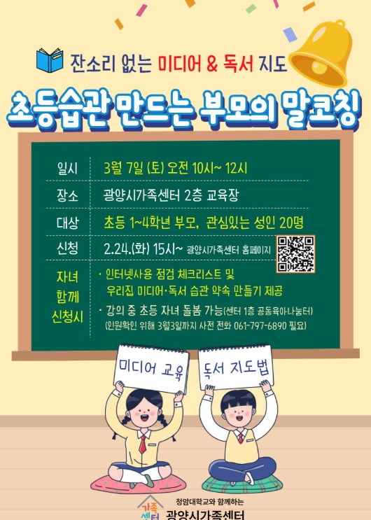 기타 자세한 교육 일정과 과정별 안내 사항은 광양시가족센터 누리집 또는 카카오톡 채널을 통해 확인할 수 있으며, 관련 문의는 광양시가족센터(☎061-797-6890)로 하면 된다.