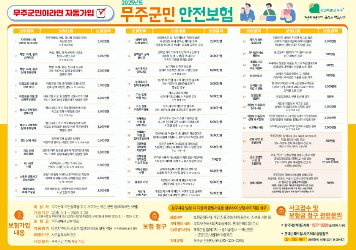 배점옥 무주군청 안전재난과 안전민방위팀장은 “무주군민이면 별도의 가입 절차 없이 자동으로 보험 혜택을 받을 수 있다”라며 “예기치 못한 사고와 재난으로 인해 어려운 상황에 부닥친 군민이 하루빨리 일상으로 복귀할 수 있도록 뒷받침하는 데 최선을 다할 것”이라고 밝혔다.