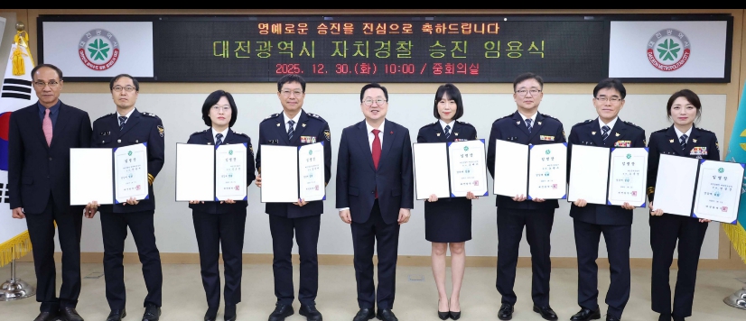 [뉴스앤톡] 대전시 자치경찰위원회는 30일 대전시청 중회의실에서 이장우 대전시장과 박희용 자치경찰위원장, 동료 직원들이 참석한 가운데 자치경찰 승진 임용식을 개최했다.