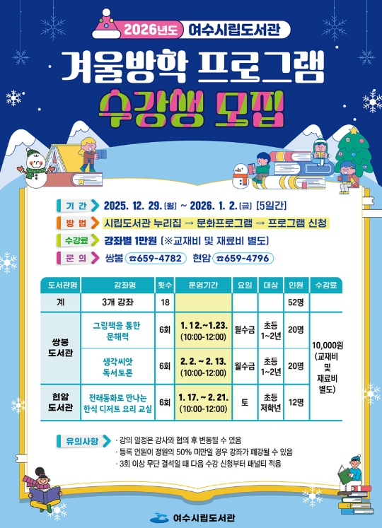 [뉴스앤톡] 여수시립도서관은 오는 12월 29일부터 2026년 1월 2일까지 5일간 관내 초등학생을 대상으로 2026년 겨울방학 프로그램 수강생 52명을 선착순 모집한다.