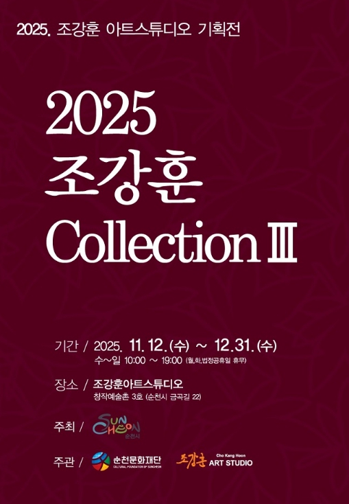 [뉴스앤톡] 순천문화재단은 오는 11월 12일부터 12월 31일까지 창작예술촌 3호 조강훈 아트 스튜디오에서 ‘2025 조강훈 컬렉션Ⅲ’ 전시를 개최한다.