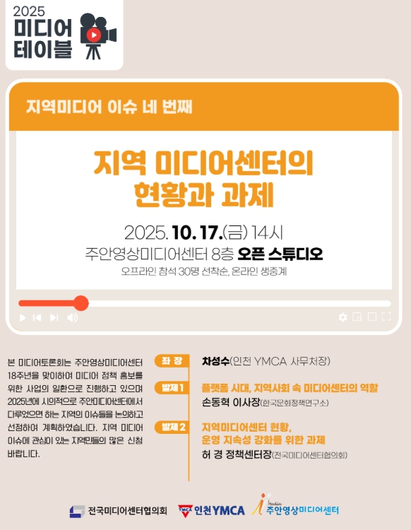 [뉴스앤톡] 인천 미추홀구 주안영상미디어센터는 오는 10월 17일 오후 2시 센터 오픈 스튜디오에서 ‘미디어 테이블: 지역 미디어센터의 현황과 과제’ 토론회를 개최한다.