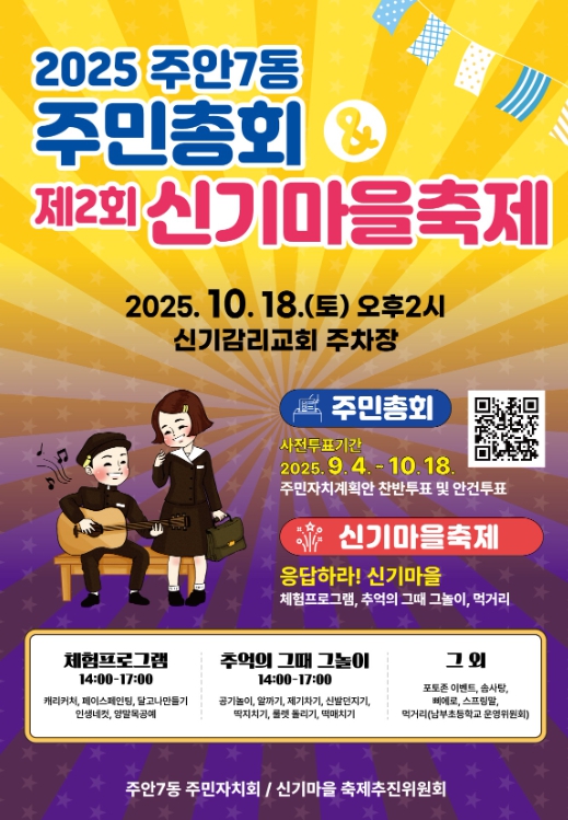 [뉴스앤톡] 미추홀구 주안7동 주민자치회는 오는 18일 신기감리교회에서 ‘주안7동 주민총회 및 제2회 신기마을 축제’를 개최한다.