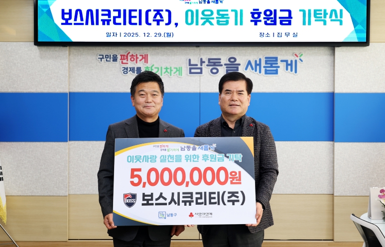 [뉴스앤톡] 인천시 남동구는 보스시큐리티 주식회사(대표이사 공병석)로부터 사회복지시설 및 단체 지원을 위한 후원금 5백만 원을 기탁받았다고 31일 전했다.