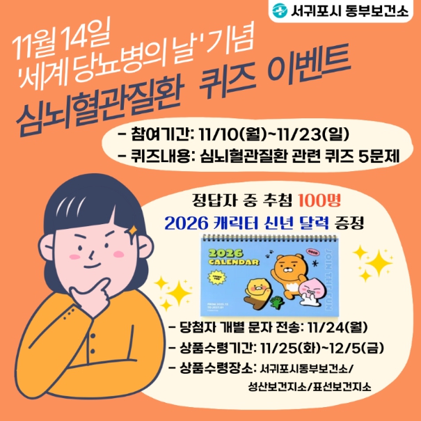 [뉴스앤톡] 서귀포시 동부보건소는 2025년 ‘세계 당뇨병의 날’을 기념하여 11월 10일부터 11월 23일까지 14일간 모바일 앱 ‘워크온’을 활용한 심뇌혈관질환 퀴즈 이벤트를 운영한다.