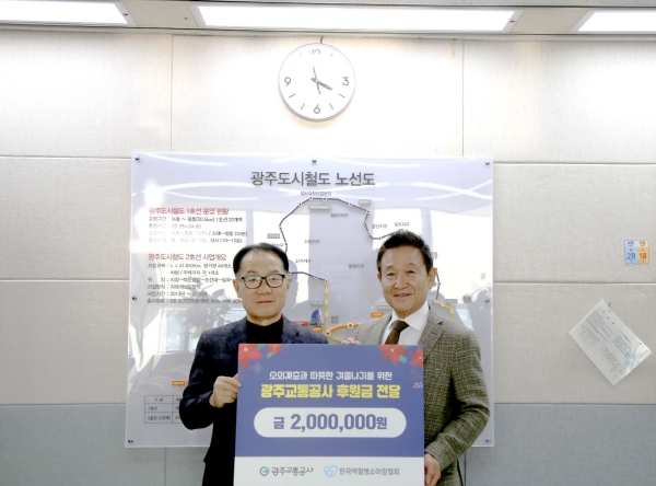[뉴스앤톡] 광주교통공사가 최근 광주시 서구 마륵동 본사에서 (사)한국 백혈병소아암협회 광주전남지회에 임직원들이 정성으로 모은 성금 200만 원을 전달하며 환아들의 따뜻한 연말연시를 기원했다.
