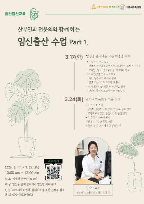 이번 교육은 제주대학교병원 산부인과 김리나 교수를 초빙해 예비 부모들이 궁금해할 수 있는 임신 준비 단계부터 출산 후 회복까지 전 과정을 체계적으로 다룰 예정이다.